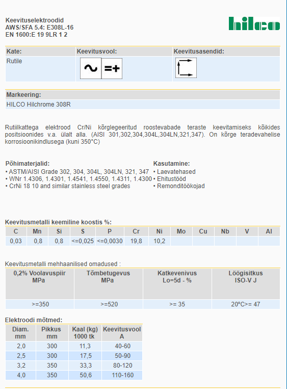 Rutiilkattega elektrood Cr/Ni kõrglegeeritud roostevabade teraste keevitamiseks kõikides positsioonides v.a. ülalt alla. (AISI 301,302,304,304L,304LN,321,347).