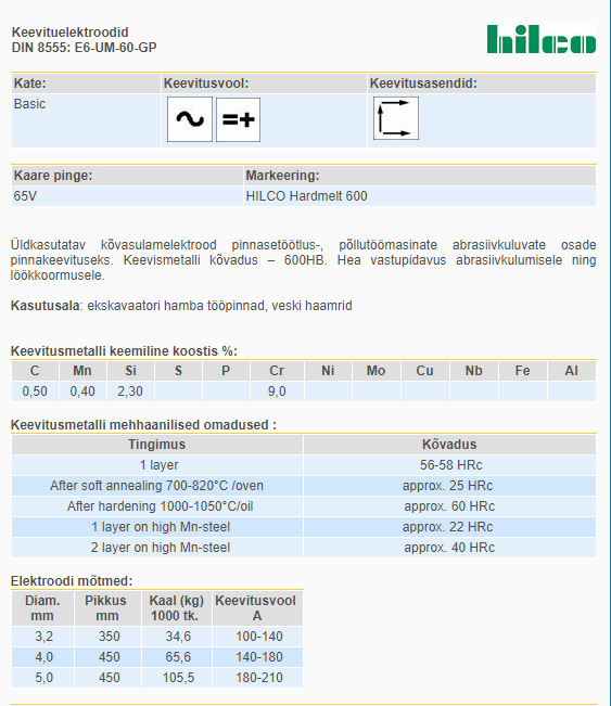 Üldkasutatav kõvasulamelektrood pinnasetöötlus-, põllutöömasinate abrasiivkuluvate osade pinnakeevituseks. Keevismetalli kõvadus – 600HB. Hea vastupidavus abrasiivkulumisele ning löökkoormusele.