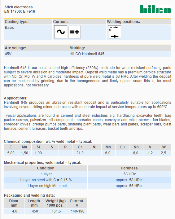 Elektrood HARDMELT 645 5.00-450 (5.0kg/pk) DIN E10-UM-60-GR HILCO