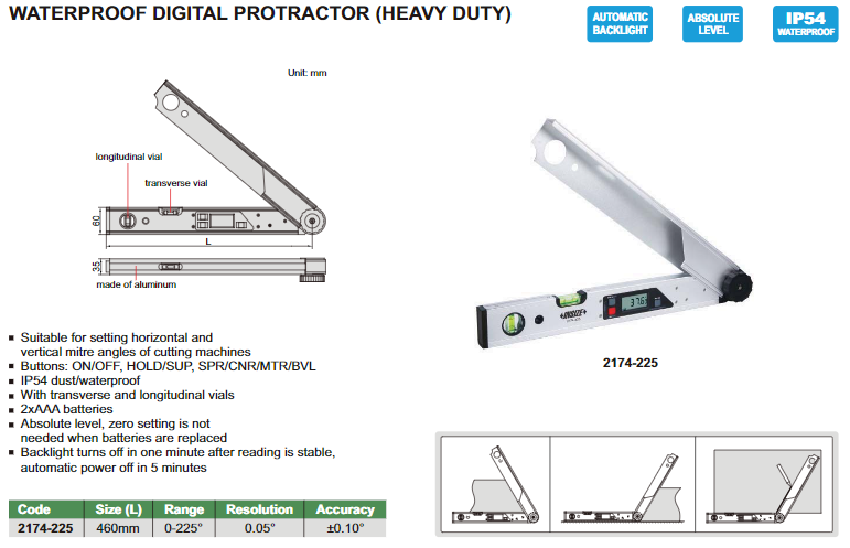 Digital protractor 460mm/0.05° IP54 waterproof INSIZE 2174-225