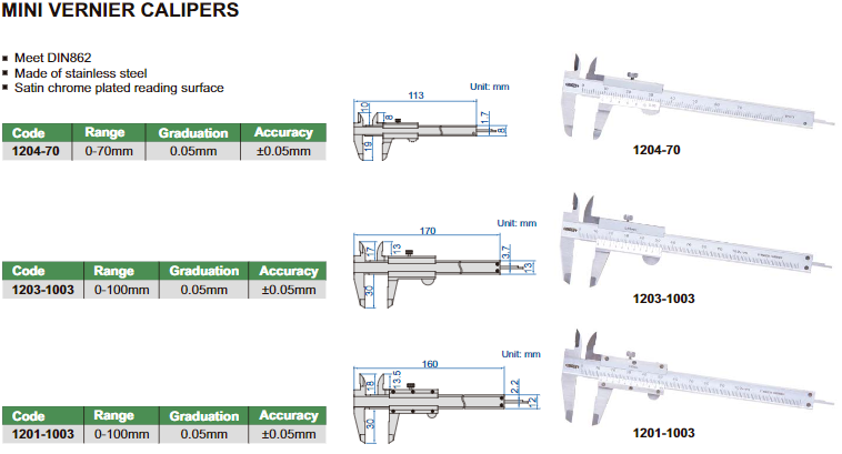 Mini vernier caliper 70mm/0.05mm INOX DIN862 INSIZE 1204-70