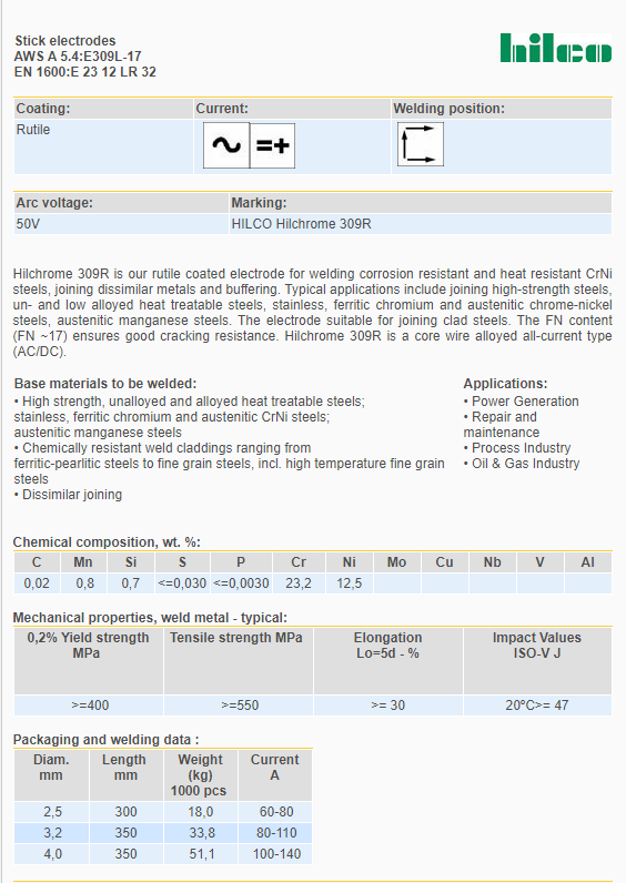 Hilchrome 309R is rutile coated electrode for welding corrosion-resistant and heat resistant CrNi steels, joining dissimilar metals and buffering.