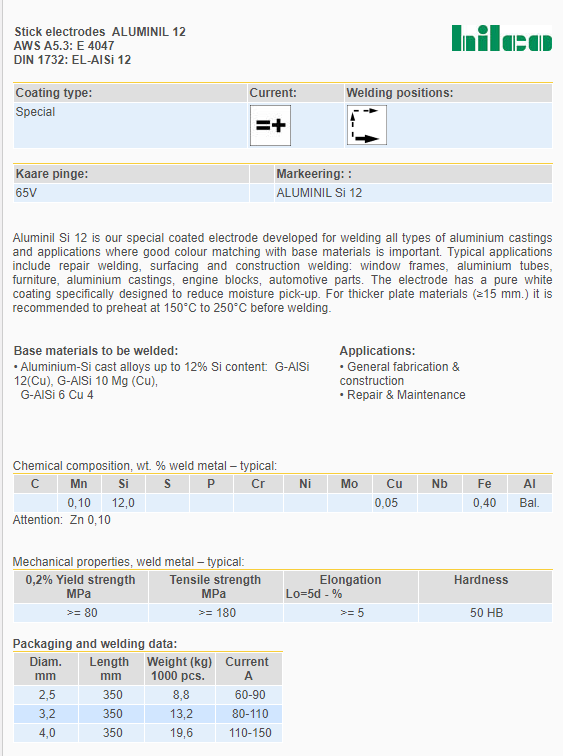 Aluminil Si12 is special coated electrode developed for welding all types of aluminium castings