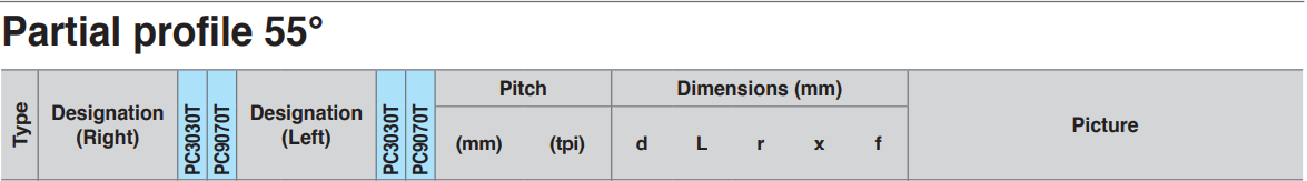 | PC3030T | Specialised grade for threading inserts | A tough sub-micron substrane with coating provides good fracture resistance. Outstanding performance on STS and hard to cut materials. |