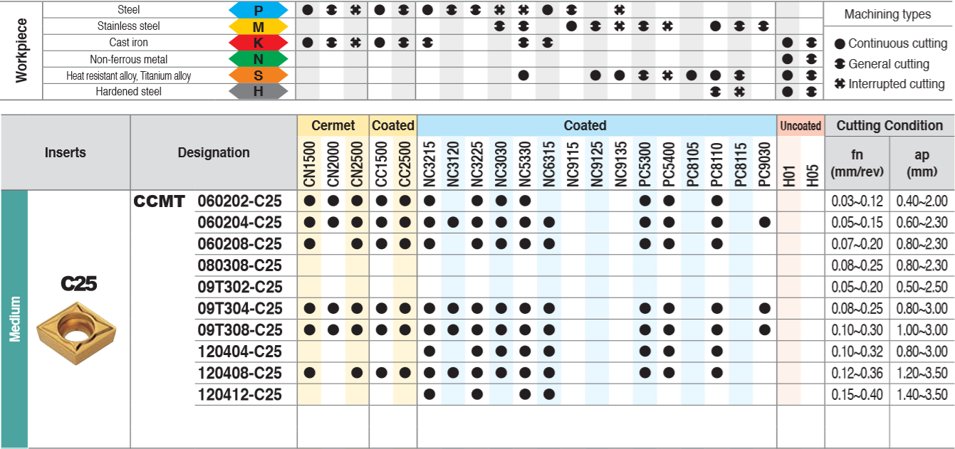 | NC3225 | P15-P25 | Universal grade for general steel and forged steel. 1st recommended grade for general machinning with the use of high tougness substrate and coating layer with improved welding/chipping resistance. |