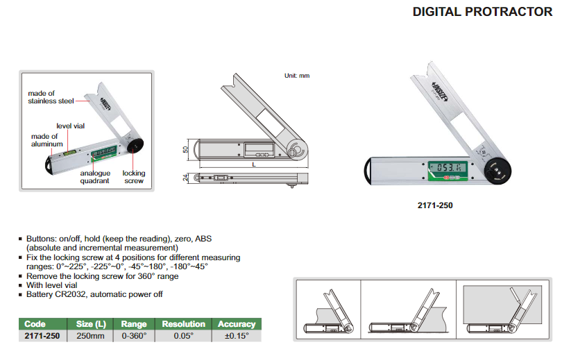 Kulmamittari DIGITAL 250mm/0.05° INSIZE 2171-250