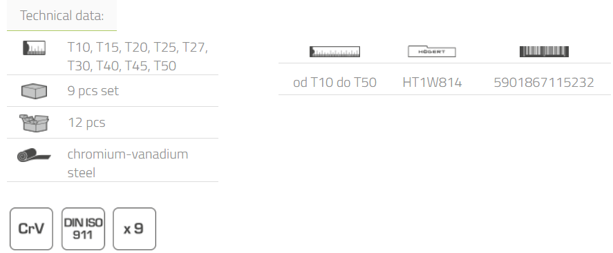 A set of universal Torx keys sized from T10 to T50. Made of high quality chromium-vanadium steel.