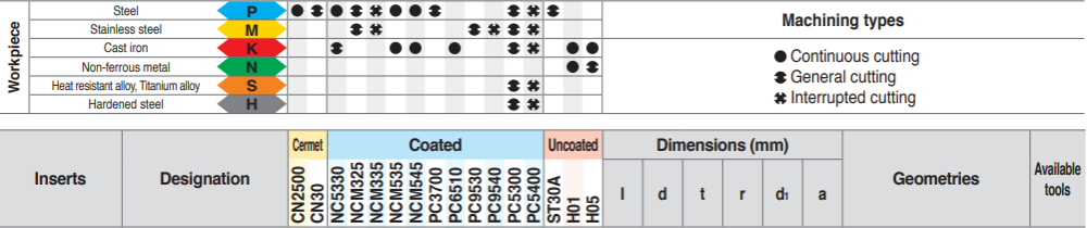 | PC3700 | P25-P35 | Exclusive grade for milling applications. Lubricated and high hardness multi-layered coating. Excellent chip removal rate due to a tough substrate specialized for steel and lubricative PVD coating of high-hardness. A highly chipping-resistant grade for minimised deviation and extended tool life under various cutting conditions. |