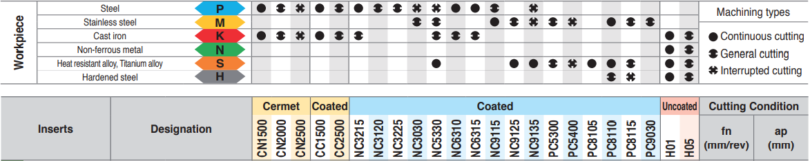 Stainless steel. General cutting for mild & forging steel. Excellent cutting performance in hard to cut materials which are vulnerable to built up edge, due to the high tough substrate with improved fracture resistance and the coated layers. |