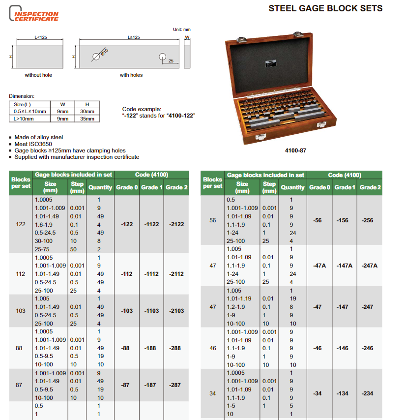 Pikkusplaadid komplekt 1.001-100mm 87tk ISO3650/0 4100-87 INSIZE
