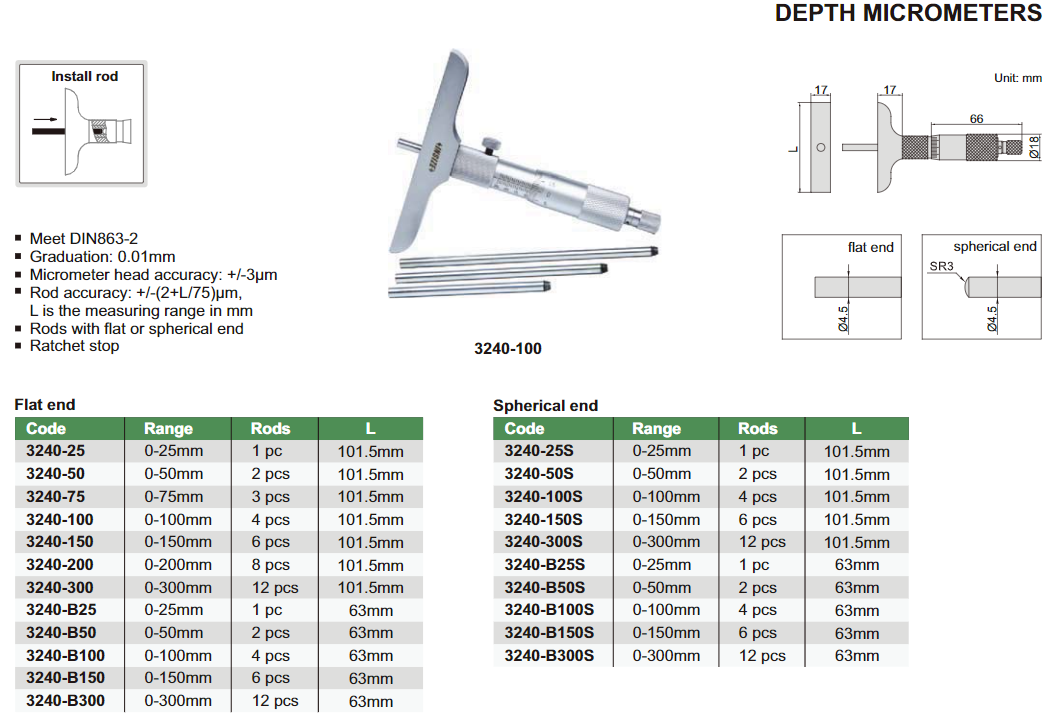 Глубиномер 0-100mm 0.01mm INSIZE 3240-100