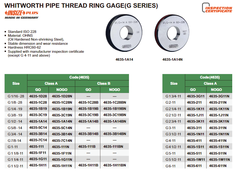Калибр-кольцо резьбовое G 1/4"x19 GO Class A INSIZE 4635-1B19