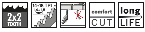- Работа без усилий — запатентованная геометрия зубьев с мелким шагом 2x2. Биметаллическое полотно для пиления материалов из стали