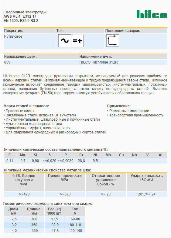 Hilchrome 312R -электрод с рутиловым покрытием, используемый для решения проблем со всеми марками сталей , включая нержавеющие и трудно поддающиеся сварке стали.
