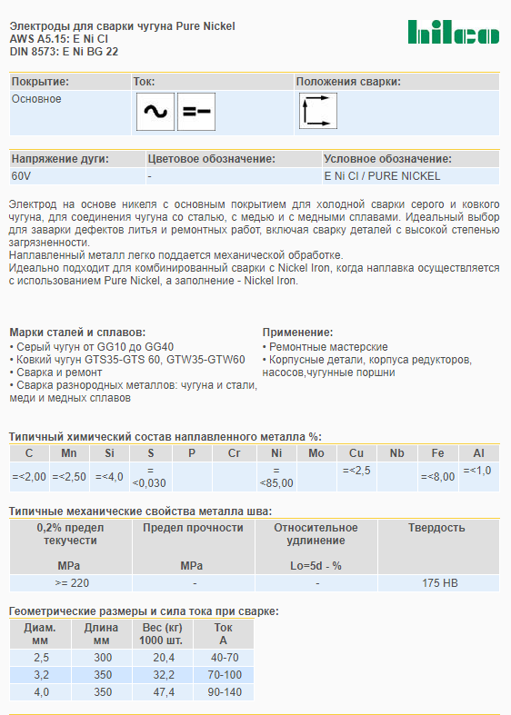 Электрод на основе никеля с основным покрытием для холодной сварки серого и ковкого чугуна, для соединения чугуна со сталью, с медью и с медными сплавами. Идеальный выбор для заварки дефектов литья и ремонтных работ, включая сварку деталей с высокой cтепенью загрязненности. Наплавленный металл легко поддается механической обработке.