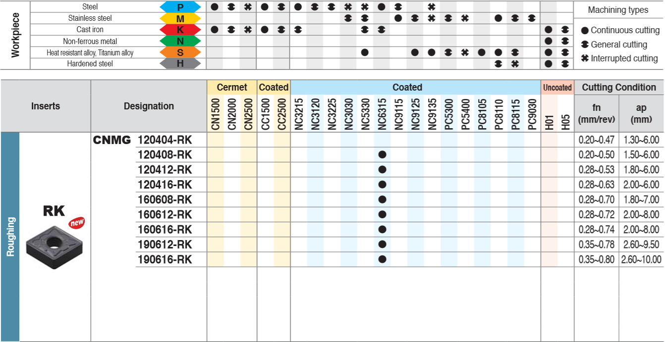 | NC6315 | K10-K15 | Универсальная марка для ковкого и серого чугуна. Превосходное качество обработки благодаря повышенному соединению покрытия (Al2O3) с высокопрочной основой. |