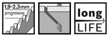 - Peen progressiivne hammaste vahe (1,9–2,3 mm) lõikab mitm. keskmisi kuni paksusid, 2,5–6 mm paksusega metallilehti
