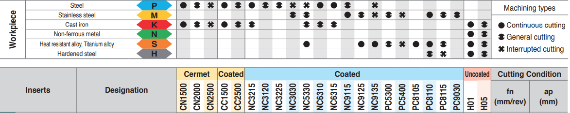 | NC3225 | P15-P25 | Universal grade for general steel and forged steel. 1st recommended grade for general machinning with the use of high tougness substrate and coating layer with improved welding/chipping resistance. |